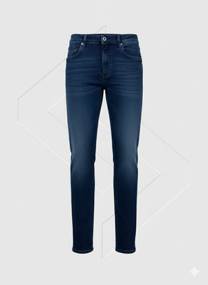 Dark wash with enzyme wash, whiskering, and scraping for an authentic worn look